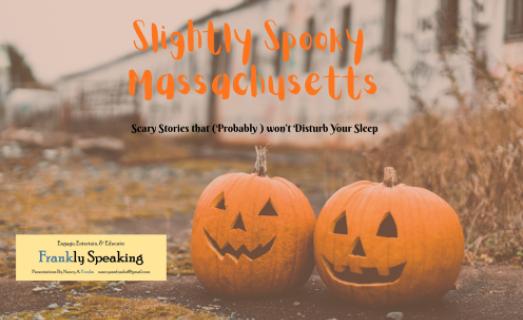 Join Nancy Franks of FRANKLY Speaking for an evening of pulse quickening, slightly scary stories from around Massachusetts. She'll explore the Hoosac Tunnel, the USS Salem and the Franklin Park Zoo to name a few. The program will be followed by a Halloween themed raffle.